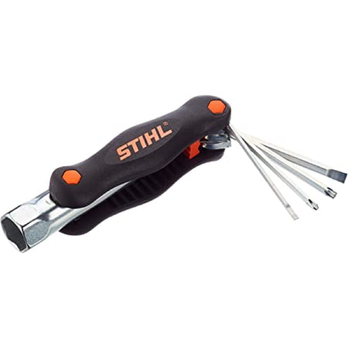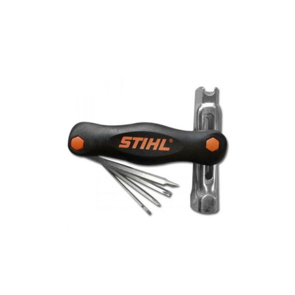 - У своєму невеликому корпусі даний мультитул вміщує: хрестоподібну викрутку 3,5 мм (може використовуватися для налаштування карбюратора та очищення гайок), хрестоподібну викрутку 7,0 мм, викрутку типу Торкс T х 27 і ключ для свічок запалювання на 19- 13;