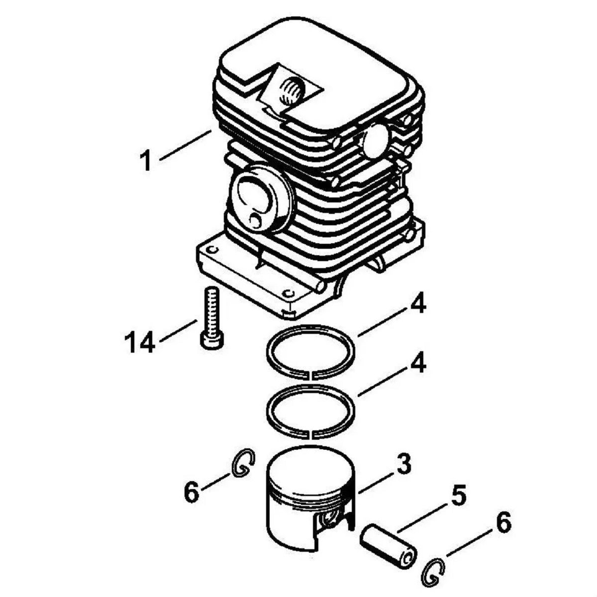 - Включає: циліндр, поршень, компресійне поршневе кільце, поршневий палець, пружинне стопорне кільце, гвинт з циліндричною головкою.